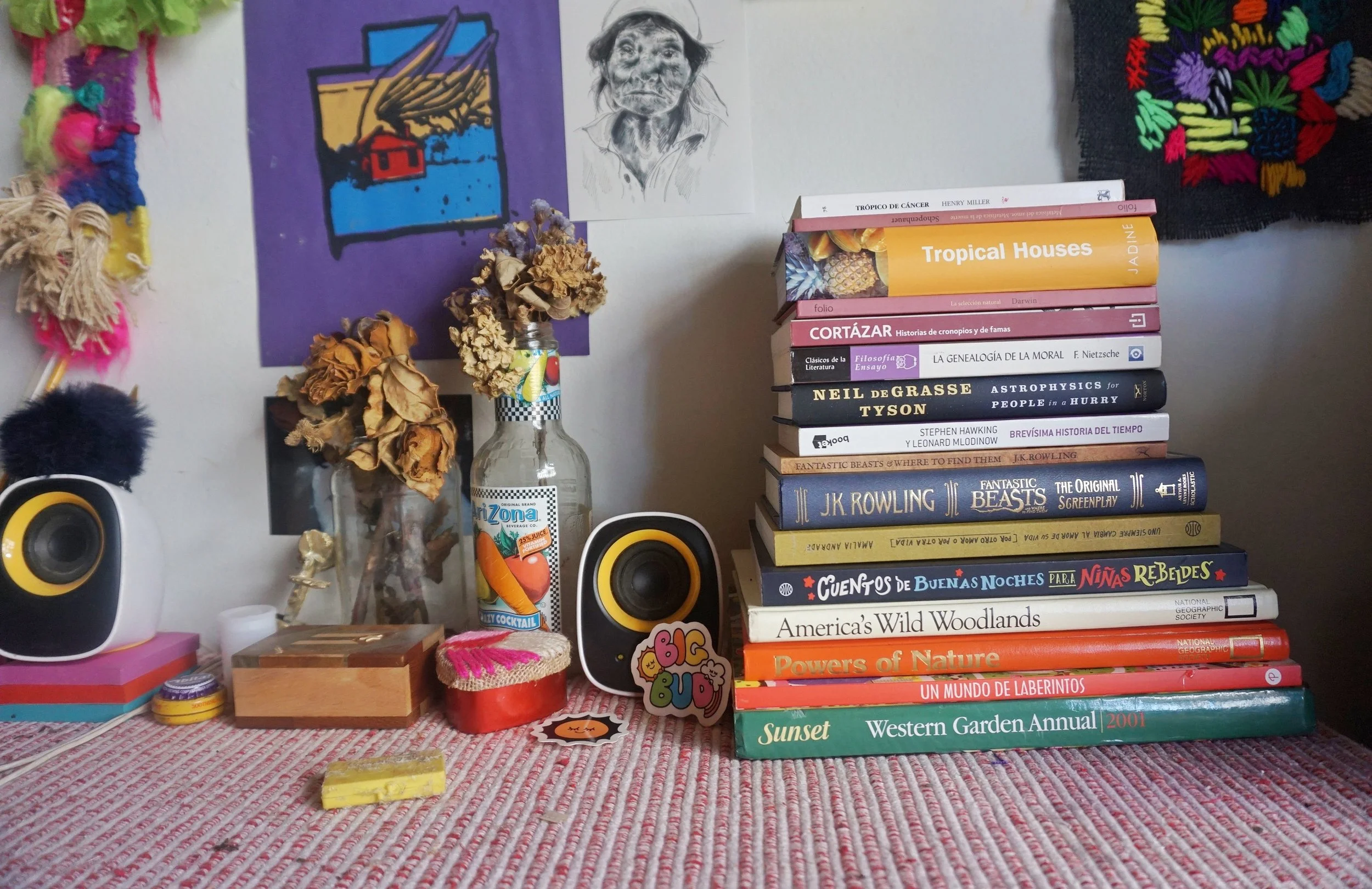 en algún momento me cuenta que a veces los profesores en la u insistían en que debía enfocarse en temas externos a ella y que es narcisista el enfocarse sólo en lo personal. yo le meto carbón al narcisismo y le pregunto más sobre sus gustos (le gusta demasiado leer, su libro es tamaño poco biblioteca, hace listas de libros por leer y le encanta harry potter), sobre su mamá, sobre su tumblr de fotos análogas y sobre los diversos chunches que adornan su cuarto.